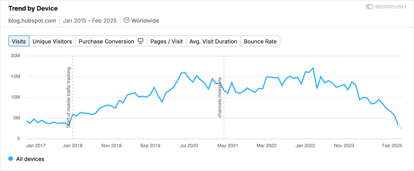 Hubspot blog is still pulling in millions of visits, but 2025 traffic is hitting new lows.