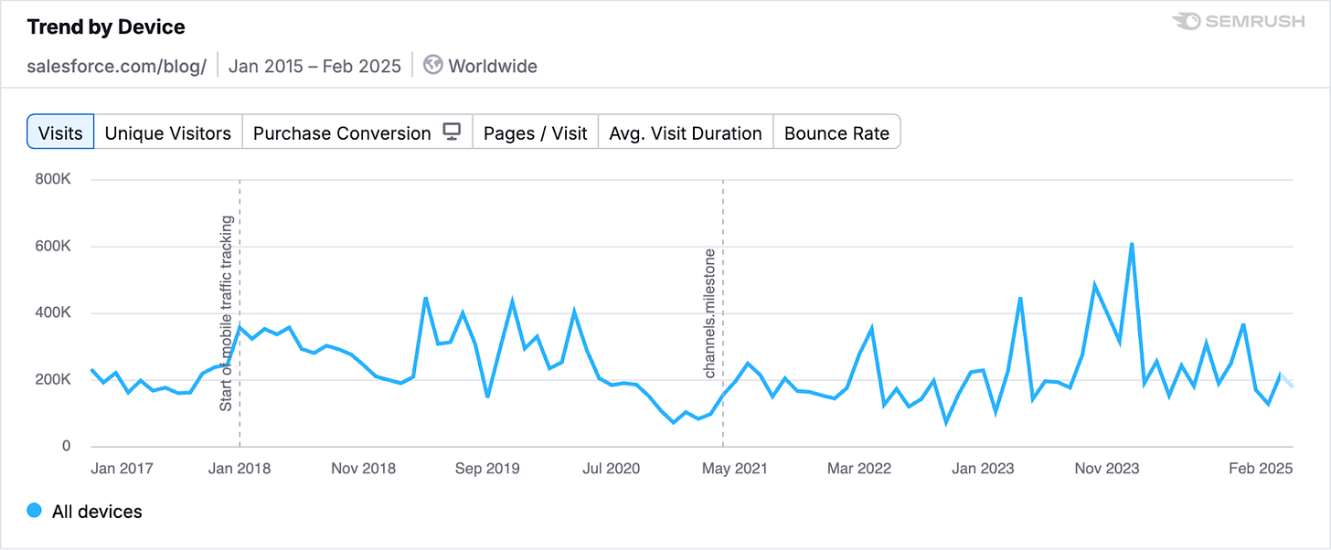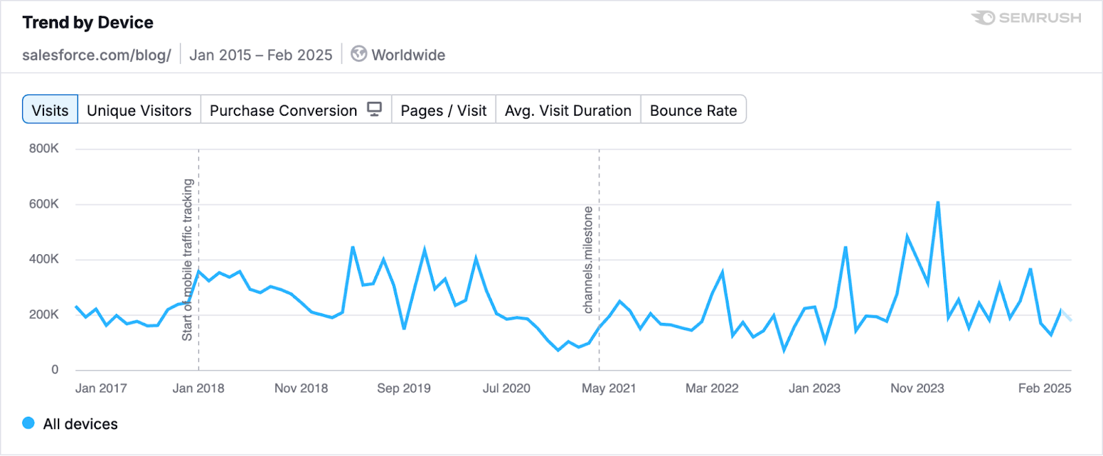 Salesforce blog is seeing stagnant growth, hovering just north of 200K visits/month.