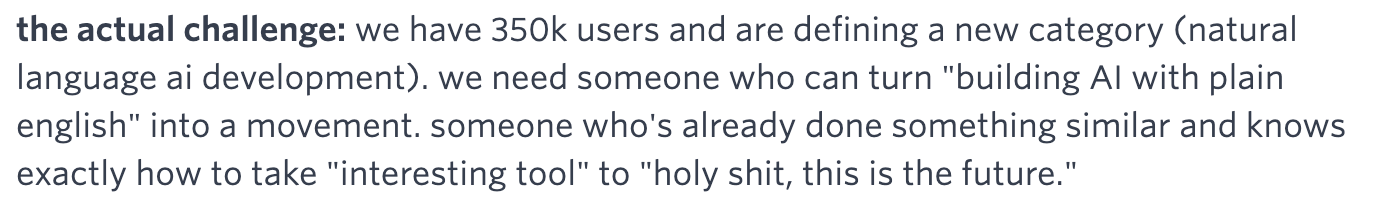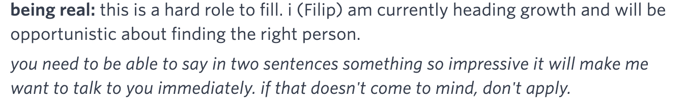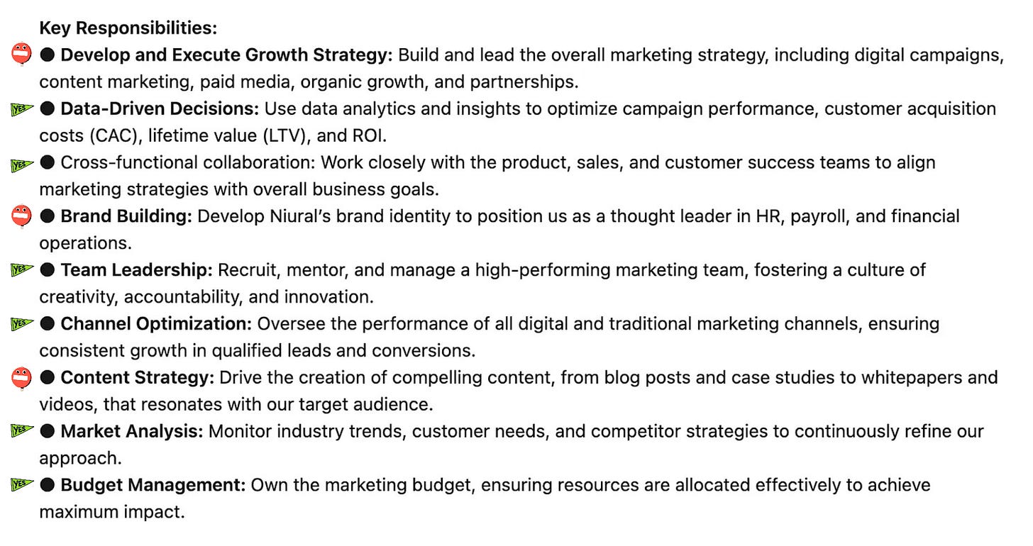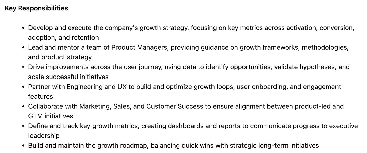 The bad: The first bullet point lost me. Under "Growth Strategy," it says "build and lead overall marketing strategy." Uh… why not just hire a Head of Marketing? That makes even more sense when you realize this role is also responsible for brand building (definitely not a growth activity) and content strategy (let’s be real - numbers people usually aren’t great at content). Please, be reasonable.