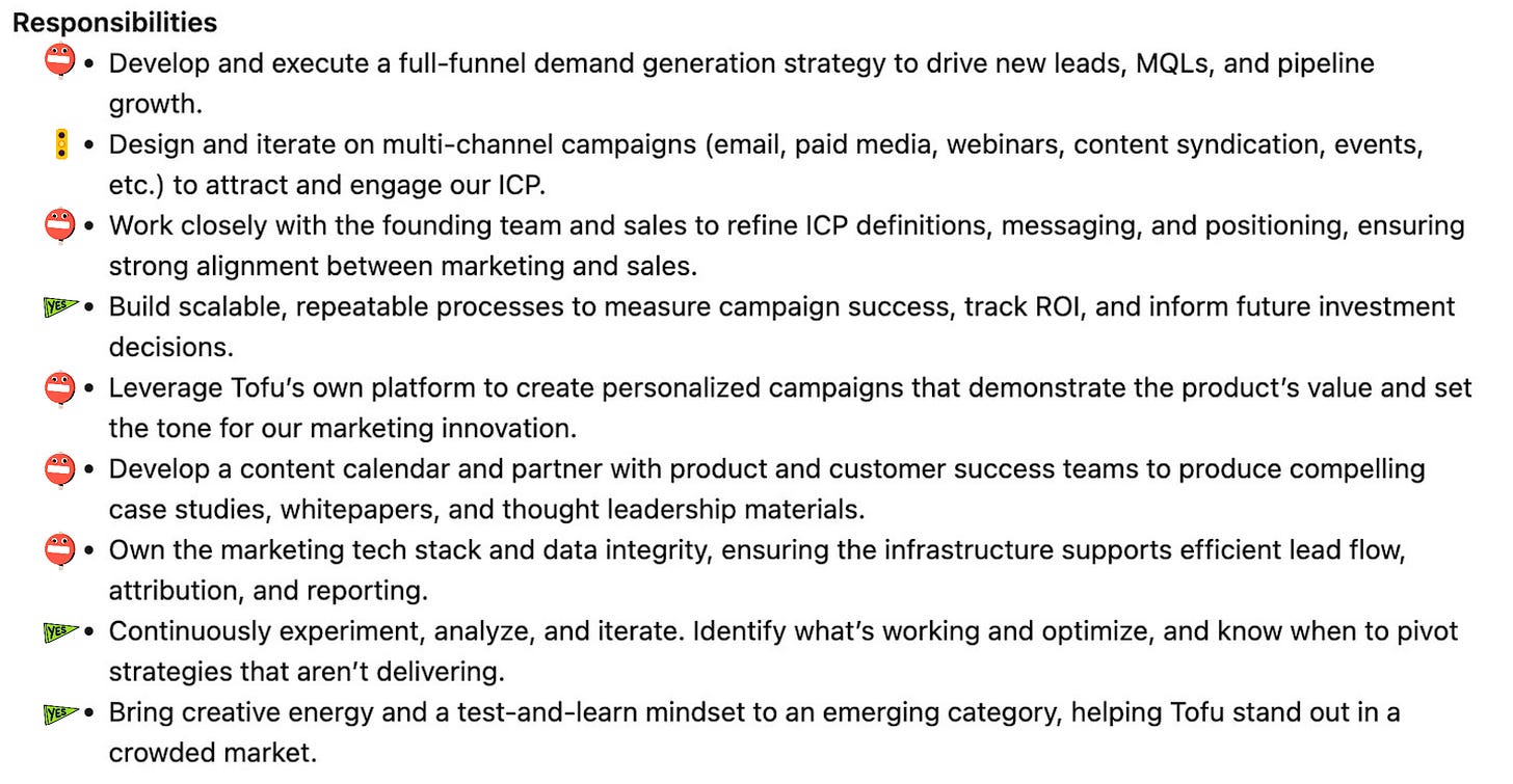 So what is this? This is marketing and growth jobs smashed together… But please repeat after me - growth is part of marketing, but not all of the marketing is growth. Growth is the performance side of marketing - think demand capture. They should be optimizing performance channels, landing pages, and user lifecycle. Marketing strategy, product launches, and HubSpot management are clearly marketing responsibilities. So please, hire a Head of Marketing for that.