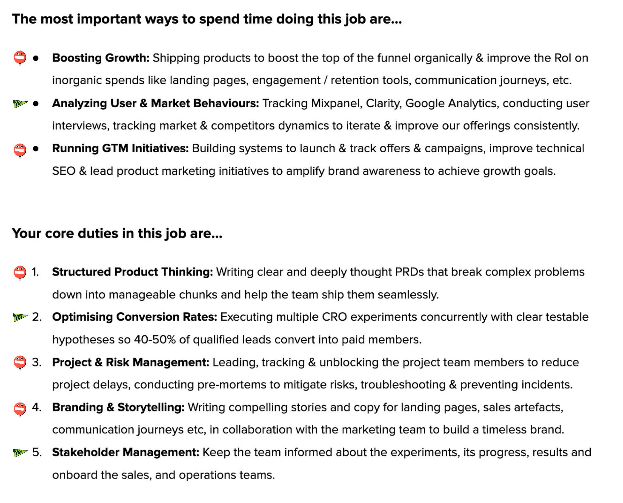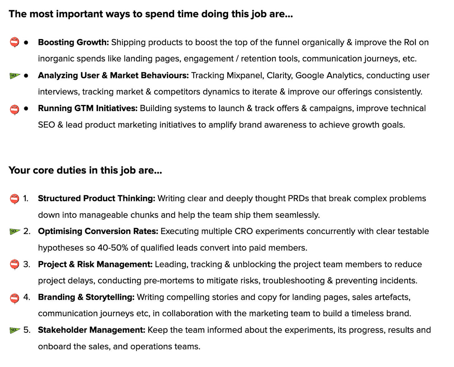 The bad: But wait, candidate is also expected to ship products? WHUT? That sounds like a core product responsibility… what is your core product doing then? Combine that with "writing clear PRDs," and now it’s looking like a core product role in disguise. But wait - then it asks the candidate to lead product marketing initiatives and write compelling copy for landing pages and sales artifacts. But wait, there is more! It throws in ownership of GTM stack, risk management, and incident prevention. I’m so confused. This is Growth, Core Product, Marketing, and Ops all wrapped up into one person.