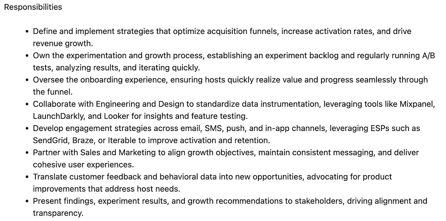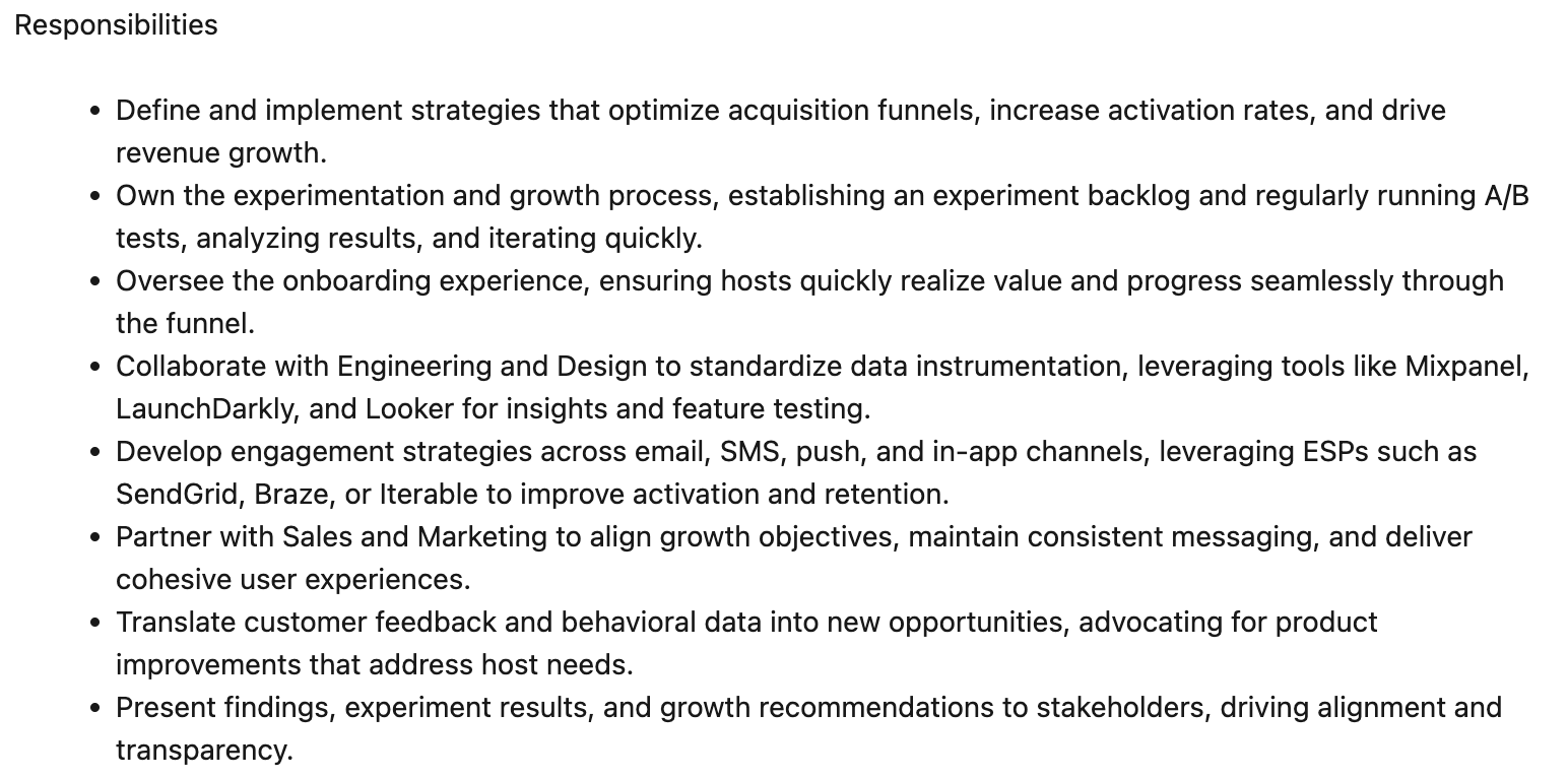 The good: It starts off strong - ownership of experimentation across channels? Nice. It even throws in some promising lines about optimizing user journeys and name-drops the golden trio: activation, retention, and conversion. Sounds solid.