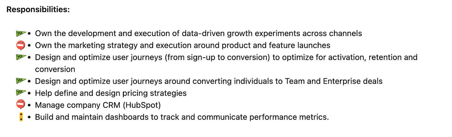 The bad: But then - bam! You’re also expected to own marketing strategy (!) and product launches (!!), meaning you’re essentially their Head of Marketing and Product Marketing. Even worse, they want growth to maintain the CRM - aka, be their marketing ops too (at least it’s just HubSpot and not Salesforce). I’m also unsure about their analytics expectations - while building your own dashboards is standard in growth, dedicated analytics resources are a must-have, and they aren’t mentioned here.