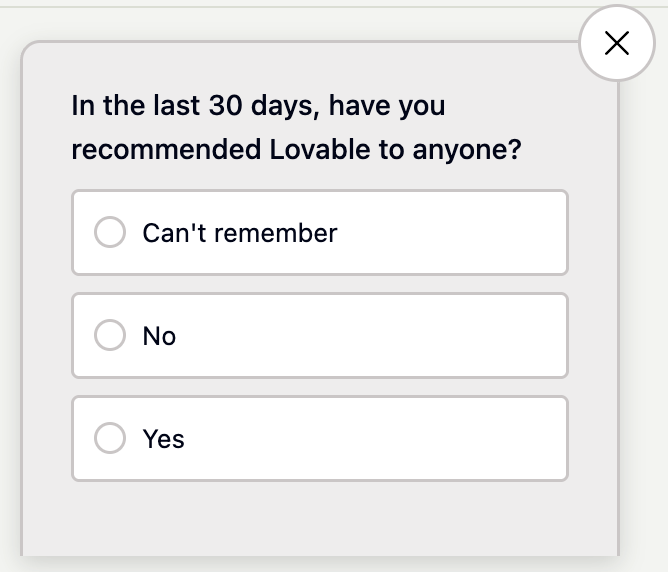This one was obvious, because Word Of Mouth is so important to us. This wouldn’t be as important for other companies that don’t rely on this, but for us, a user’s likelihood to spread the word is crucial. But! I also don’t like NPS because of the lack of actionability - someone saying that they think they’re likely to talk about your product does not guarantee that they actually will. So, we added a bonus question: “Did you actually refer Lovable to a friend or family member in the last 30 days?”