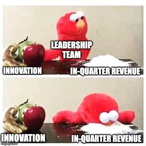 The leadership team initially gave lip service that they would do it. But when the time came, every quarter was just a slow, steady axing of every single innovation initiative or long-term bet. ‘No time for that, we need to drive revenue!’