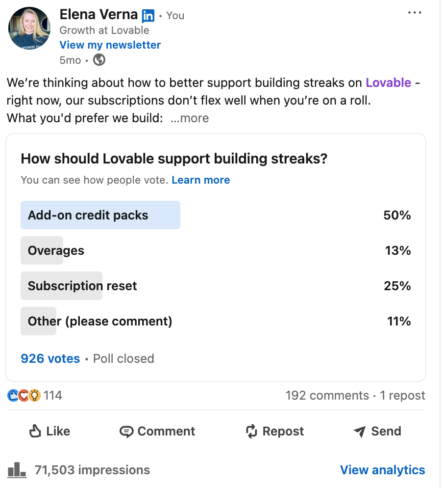 First, I started with polling on Linkedin. The key question was - how do we approach this? Do we allow subscriptions to go into overages, and then you can pay for overages as a one-off? Do we actually offer top-ups? Is there some other method?